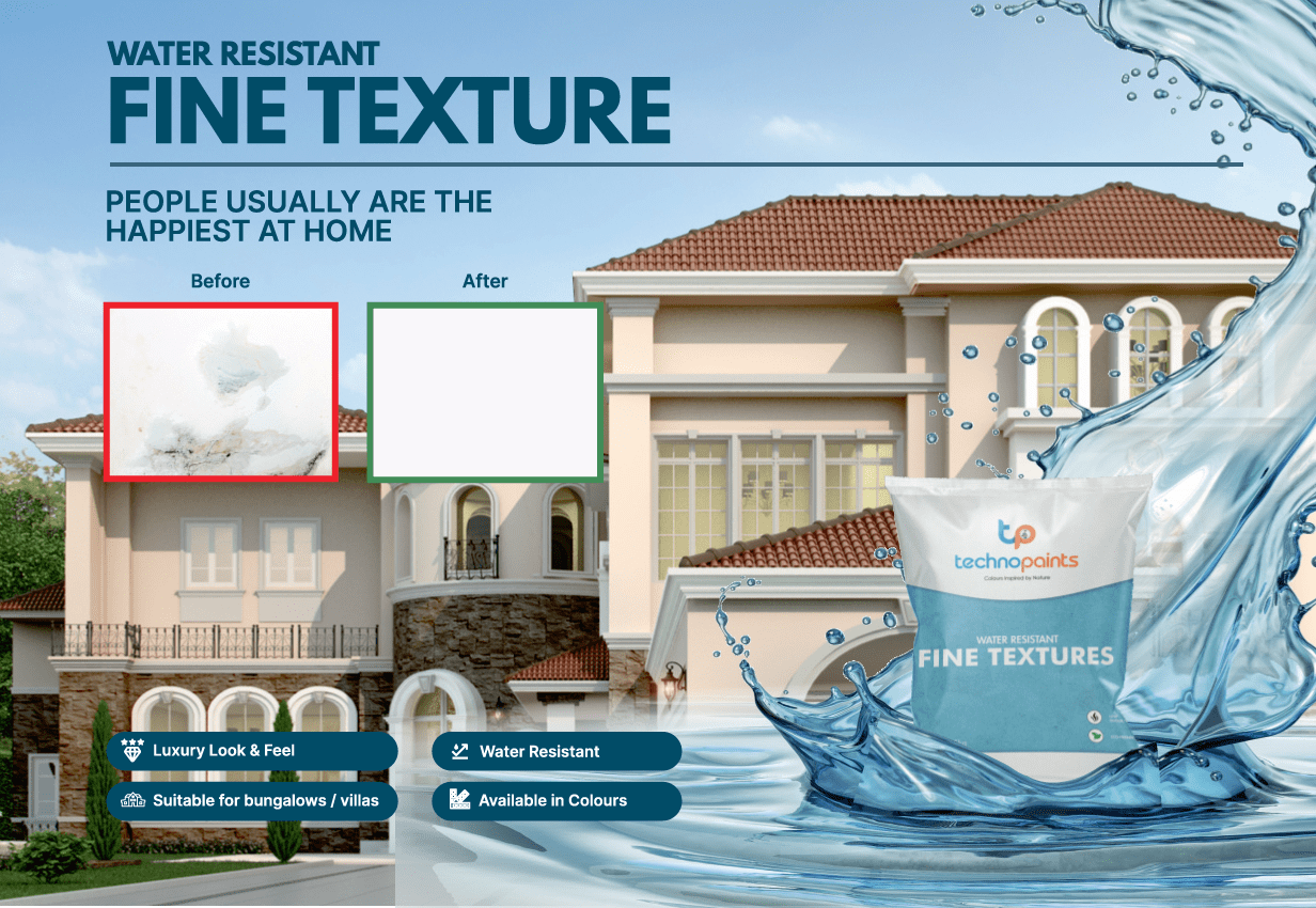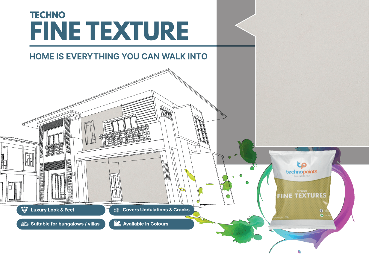 Elevate your home's exterior with Techno Paints Water Resistant Fine Texture. This premium finish creates a luxurious look and feel while providing superior protection against the elements. Its water-resistant formula safeguards your home from moisture damage, ensuring long-lasting beauty. Suitable for bungalows and villas, Fine Texture adds a touch of elegance and durability to your property.