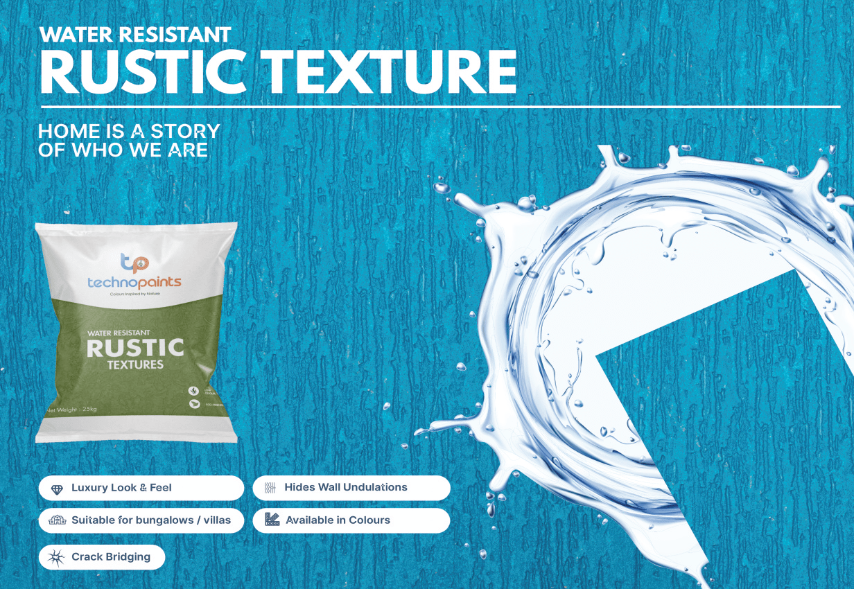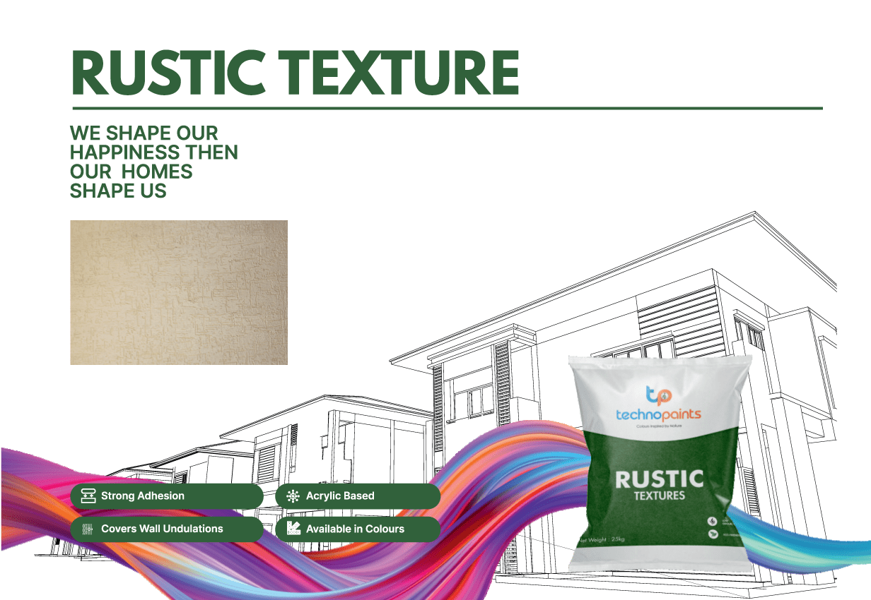 Express your unique style with Techno Paints Rustic Texture. Inspired by the philosophy that “We shape our happiness, then our homes shape us,” this textured finish adds a touch of rustic charm to your walls. With strong adhesion, acrylic-based formulation, and a range of colors, Rustic Texture not only enhances your home’s aesthetic appeal but also provides a durable and long-lasting finish.
