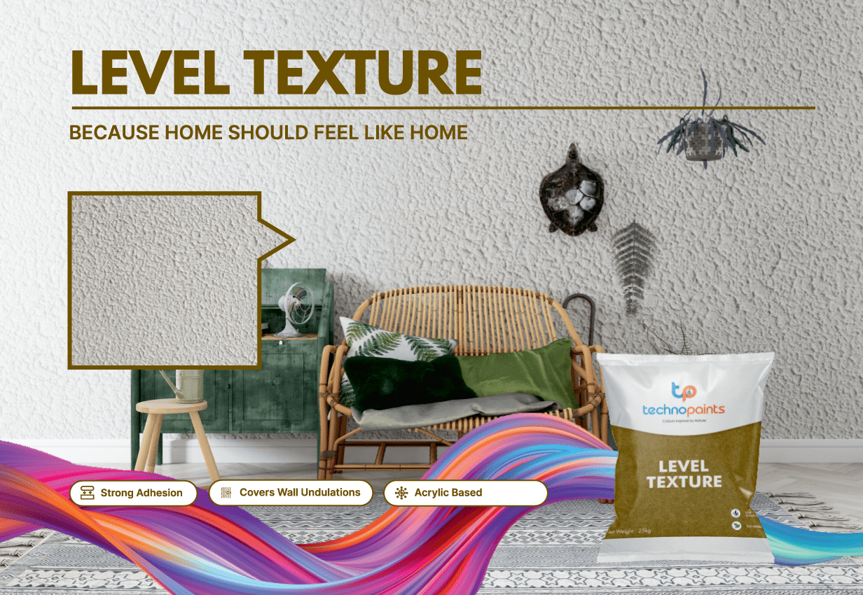 Experience the comfort of home with Techno Paints Level Texture. This elegant finish creates a smooth and sophisticated look, transforming your walls into a haven of tranquility. Its strong adhesion ensures durability, while its acrylic base offers a flawless finish. Level Texture covers wall undulations, creating a serene and inviting atmosphere in your living spaces.