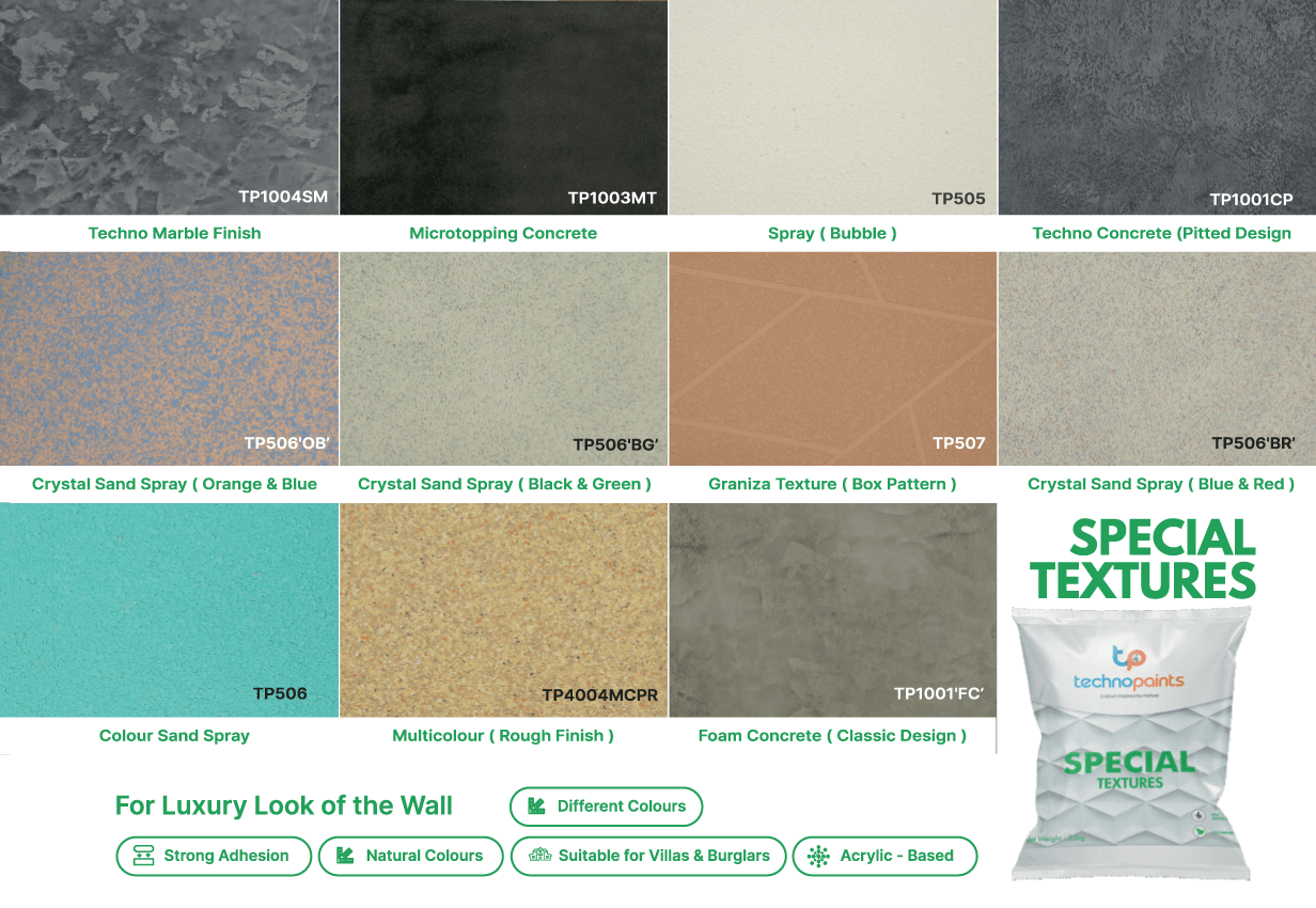 Elevate your walls with Techno Paints Special Textures. This diverse collection offers a range of stunning finishes, from elegant marble and concrete effects to unique crystal sand sprays and vibrant multicolors. Create a luxurious look and feel with strong adhesion, natural colors, and suitability for villas and bungalows. Explore the possibilities and add a touch of personality to your spaces.